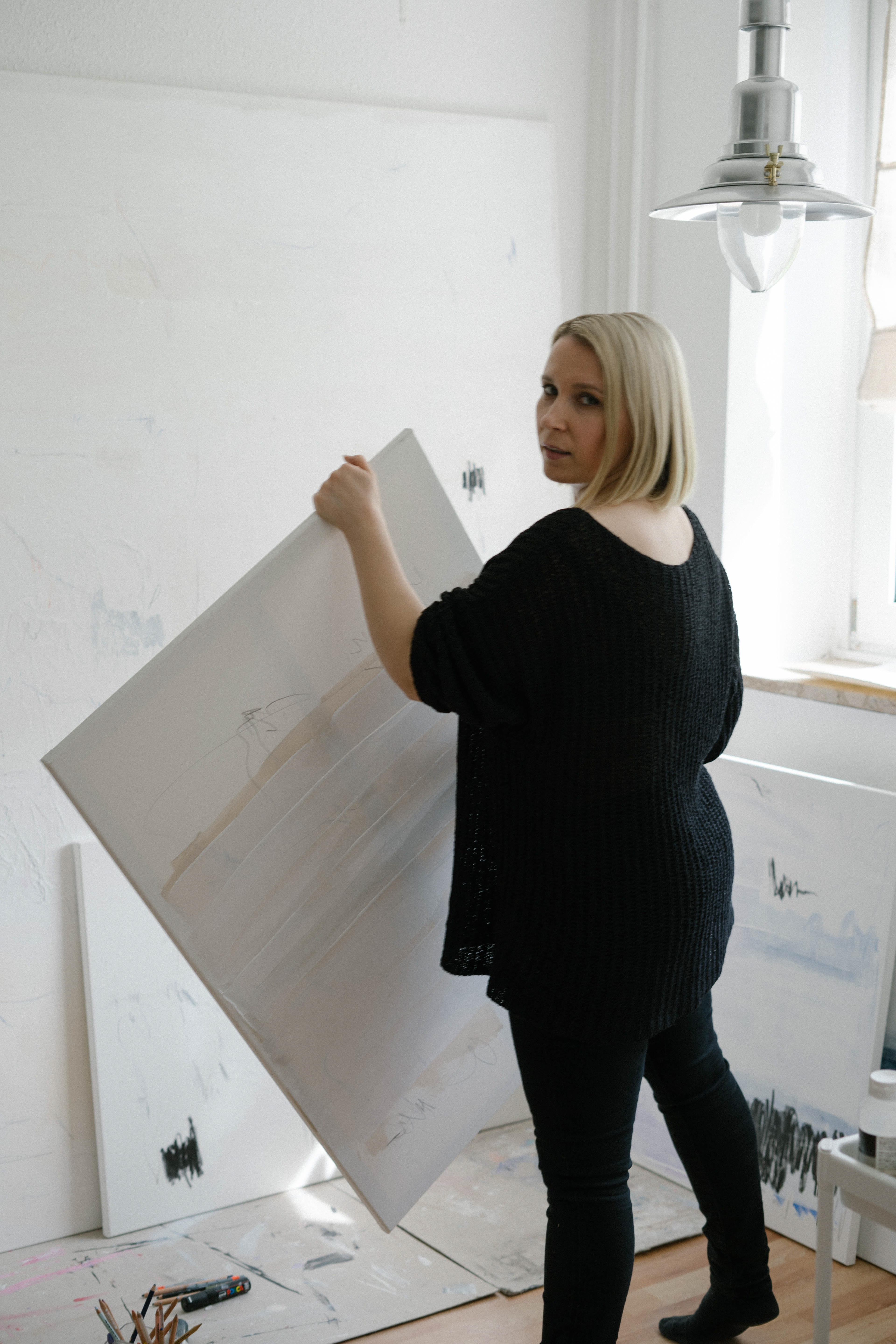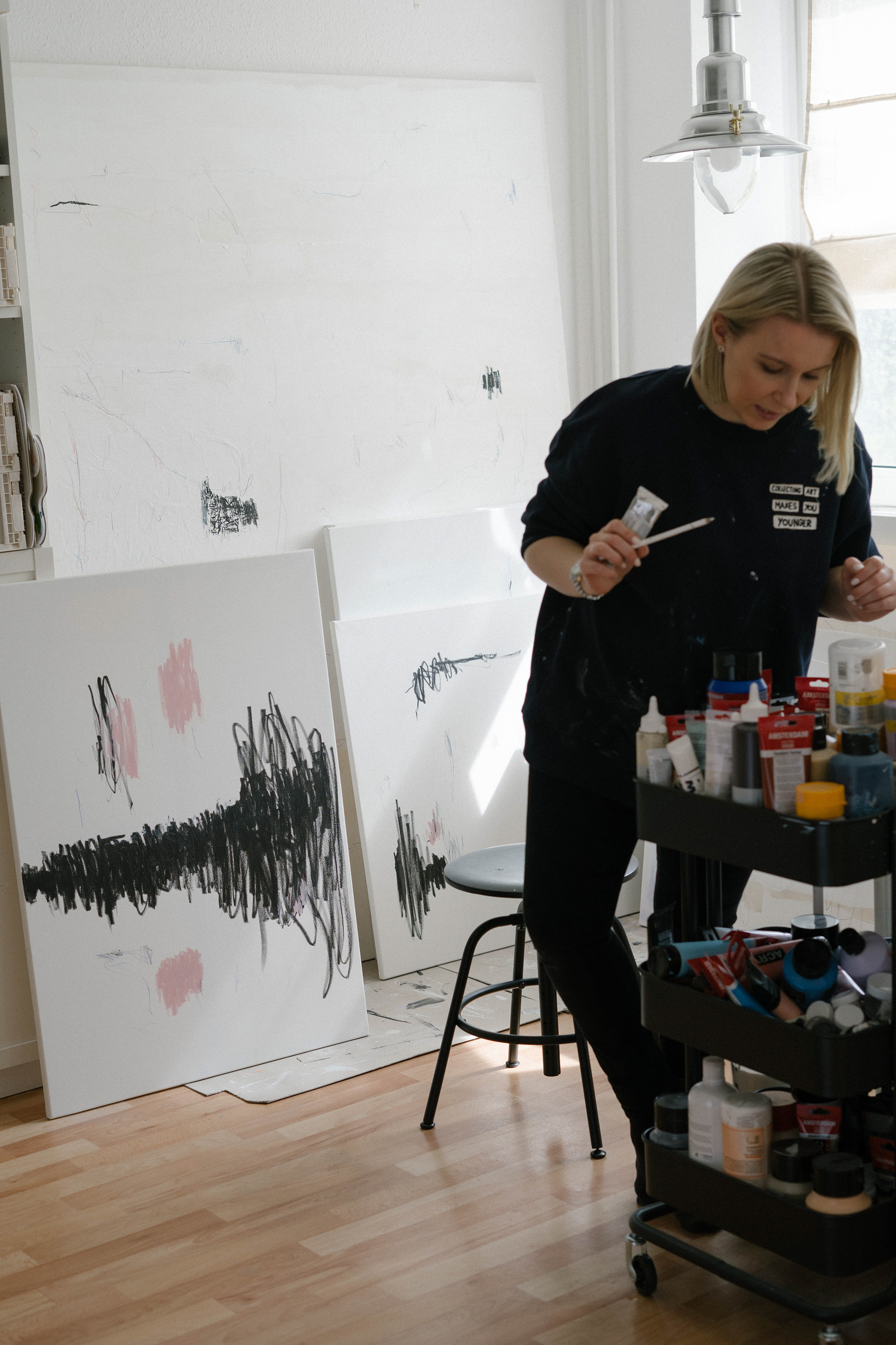 Statt von klassischen Themen oder äußeren Einflüssen inspiriert zu sein, folgt sie in ihrer Arbeit vielmehr dem inneren Impuls, bestimmte Bewegungen auf der Leinwand auszuprobieren und die Eigenheiten der Materialien zu erforschen.